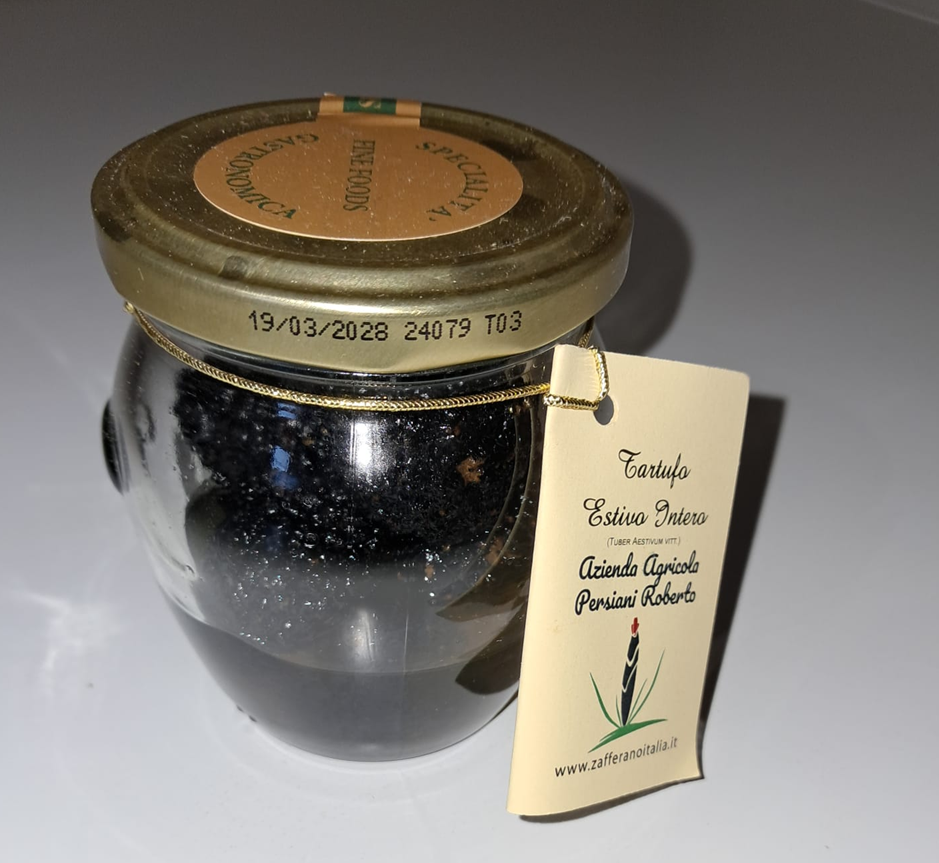 Ingredienti: Funghi Champignon (Agaricus Bisporus) 75,7%, Tartufo Estivo (Tuber aestivum Vitt.) 5%, olio extra vergine di oliva, sale.